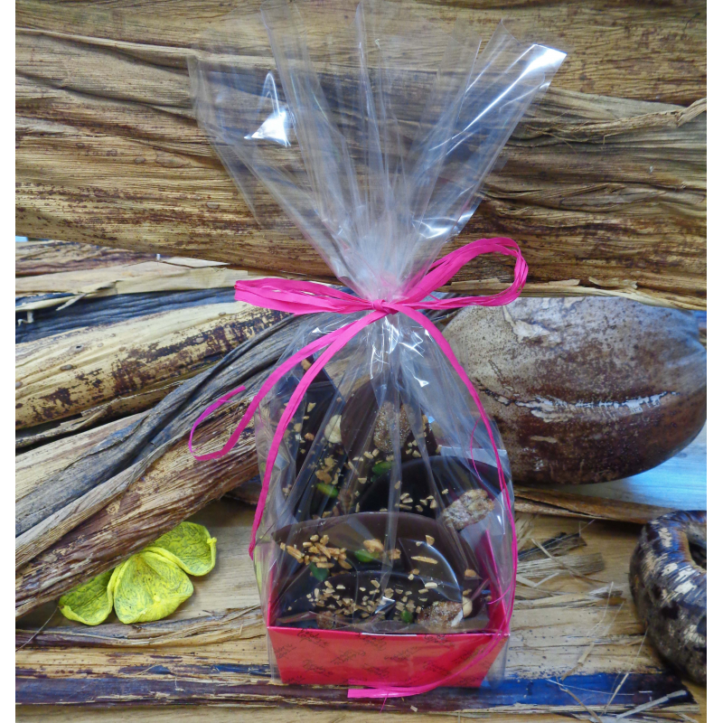 Ballotins de 300 gr ou 450 gr composés de gourmands morceaux de chocolat noir et lait parsemés de fruits secs.